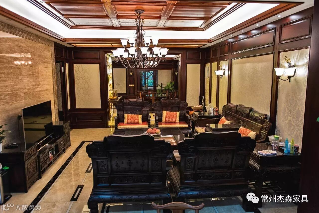 客厅:总体布局对称均衡,端正稳健。摆放的红木家具更突显了中国传统家具的设计特点,古朴典雅,颜色深沉,造型独特,雕刻精美,能够表现精雕技术的高超,欣赏起来很耐人寻味。