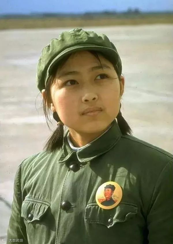 1972年,上海,在上海机场佩戴毛泽东像章的年轻女孩。约翰·多明尼斯/摄。