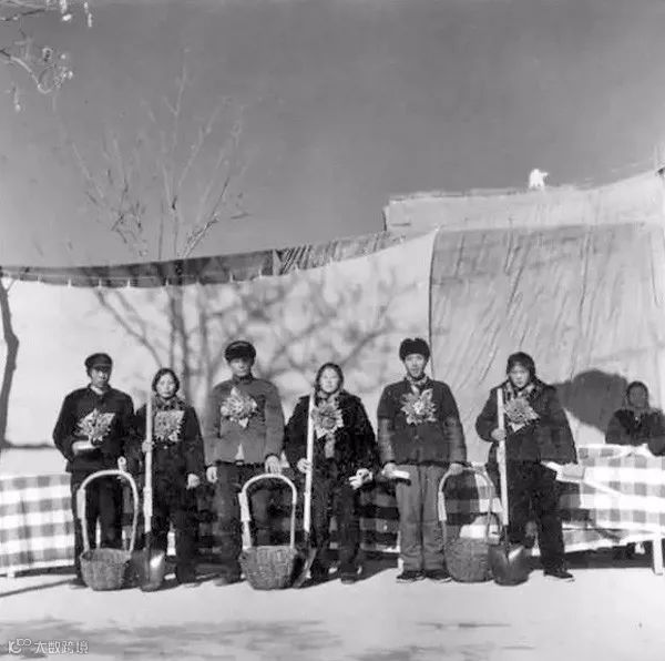 1974年11月1日,河北赵县杨家郭,三对新婚夫妇。在这个喜庆的日子里,他们收到的新婚礼物是一把铁锹,一个筐筐。