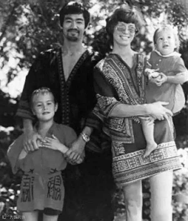 李小龙全家福。照片大约拍摄于1971-1972年之间。李小龙双手扶着这个小孩是他的儿子李国豪,右边是李小龙夫人琳达·埃莫瑞,她怀中抱着是他们的女儿李香凝。