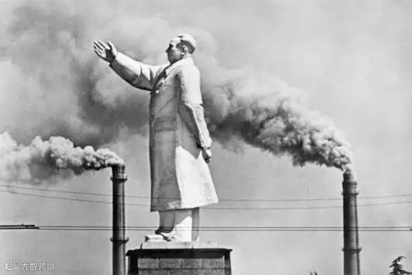 1971年,武汉长江边上,矗立在两个烟囱之间的毛主席像,烟囱是中国新工业化的象征。马克•吕布/摄。