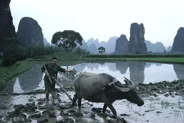 1979年,桂林高田镇,一名军官指挥水牛在水田里耕作。久保田博二/摄。