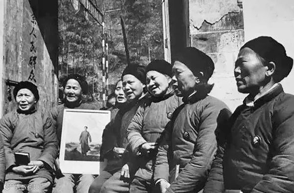 1972年,江苏省南通市海安县敬老院老人晒太阳也不忘表忠心,帶上毛主席画像学语录。晓庄/摄。