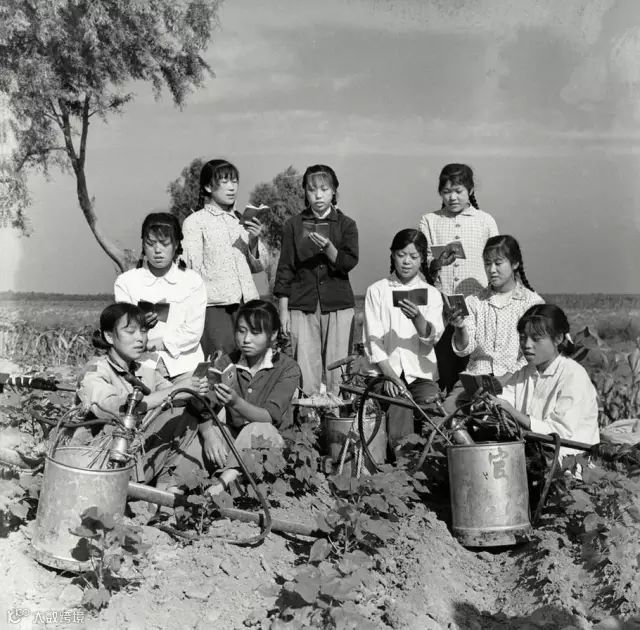 1970年,辽宁省海城县,女知青在劳动之前学习毛主席语录。许魁武/摄。