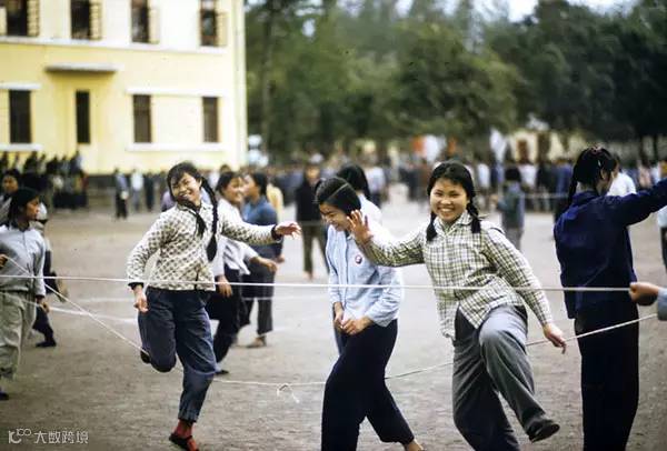 1972年,广州第61中学女学生课间休息跳皮筋。威廉·约瑟夫/摄。