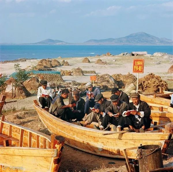 1971年,山东,渔民聚在船上一起学习毛主席著作。翁乃强/摄。