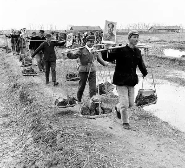 1972年,干活不忘毛主席,江苏省南通市郊农民劳动时在扁担上的挂起了毛主席像。晓庄/摄。