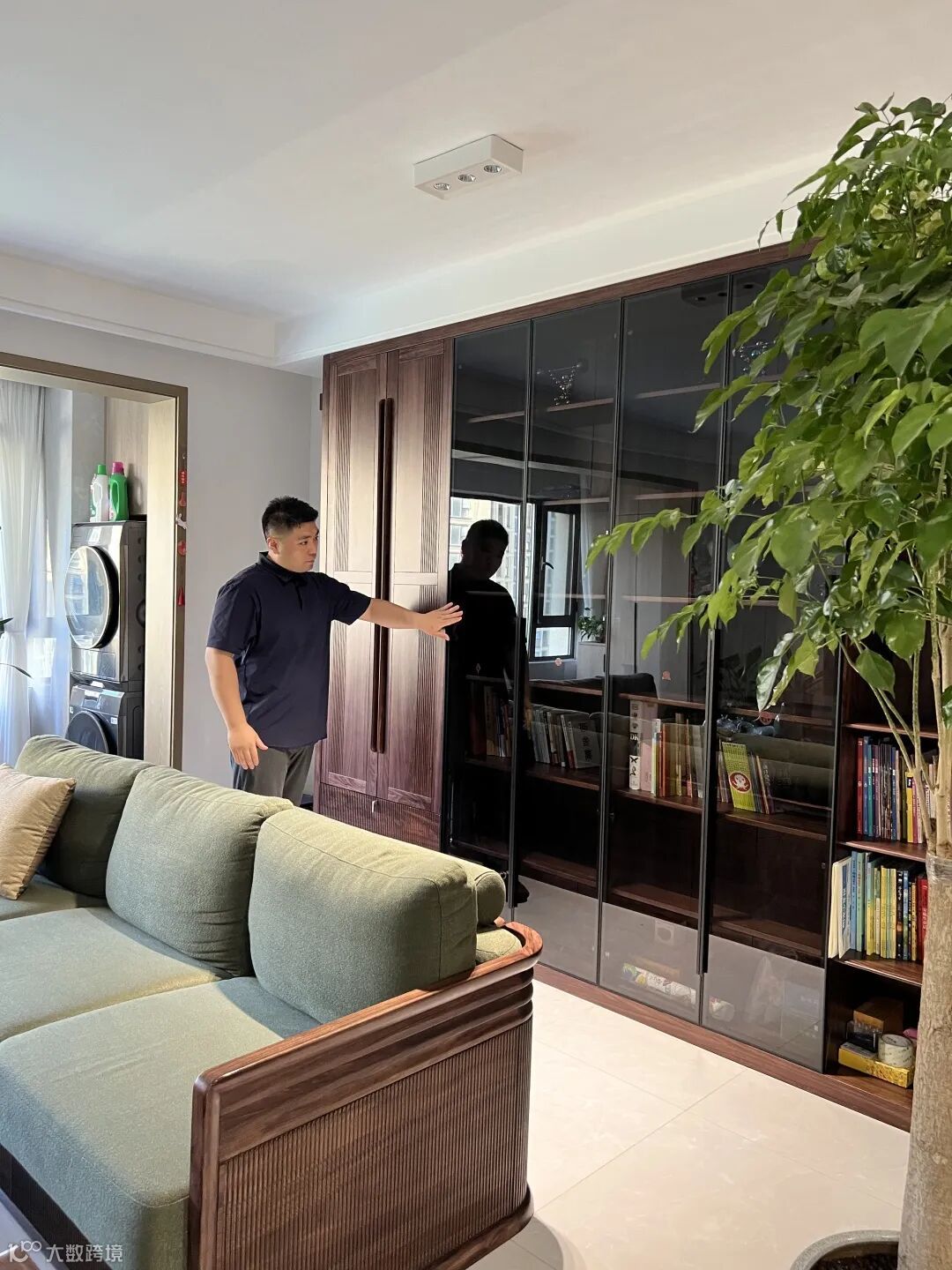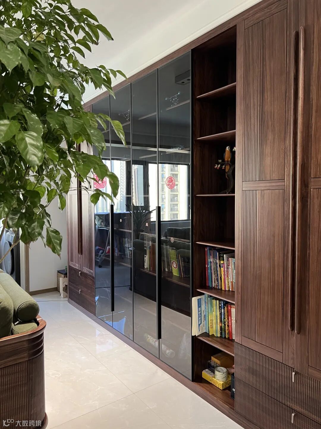 客厅区,最抢眼的就是这一整墙的大书柜,只做了一小部分的开放格其余都做了木门玻璃门与抽屉,木门的拉手做了一个外置拉手,做了凹槽设计,开门也更好开一些,木门与抽屉的面板都做了拉槽工艺,抽屉外置铜拉手开关也很顺滑