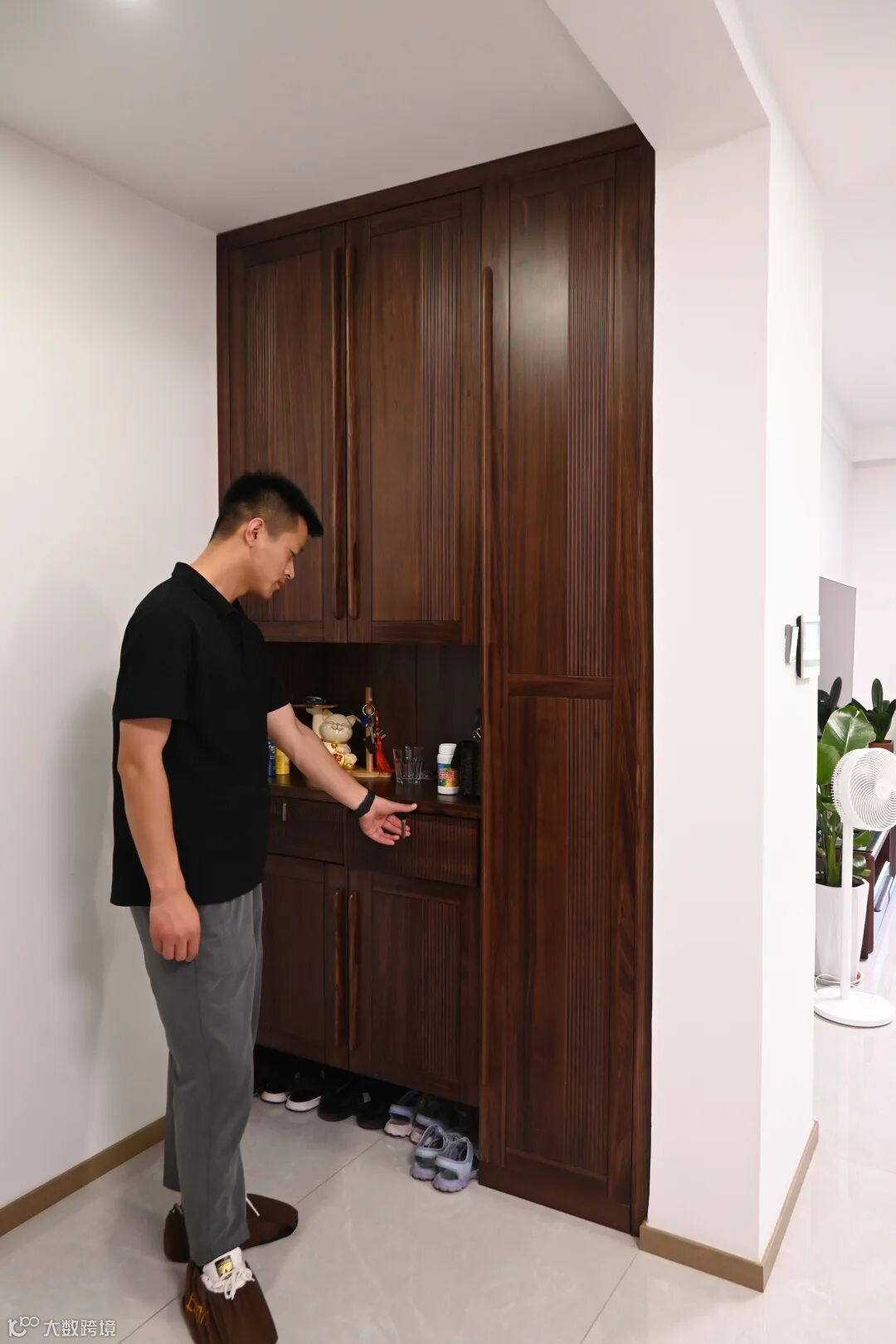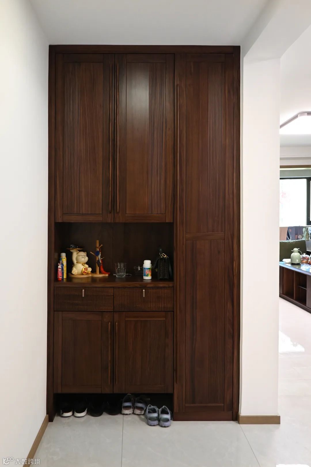 2.4米的玄关柜+鞋柜中间做了开放区,放置一些随手的东西,上方储物下方放鞋中间还做了两个抽屉,右侧做了挂衣区尤其是冬天挂放一些外套会很方便