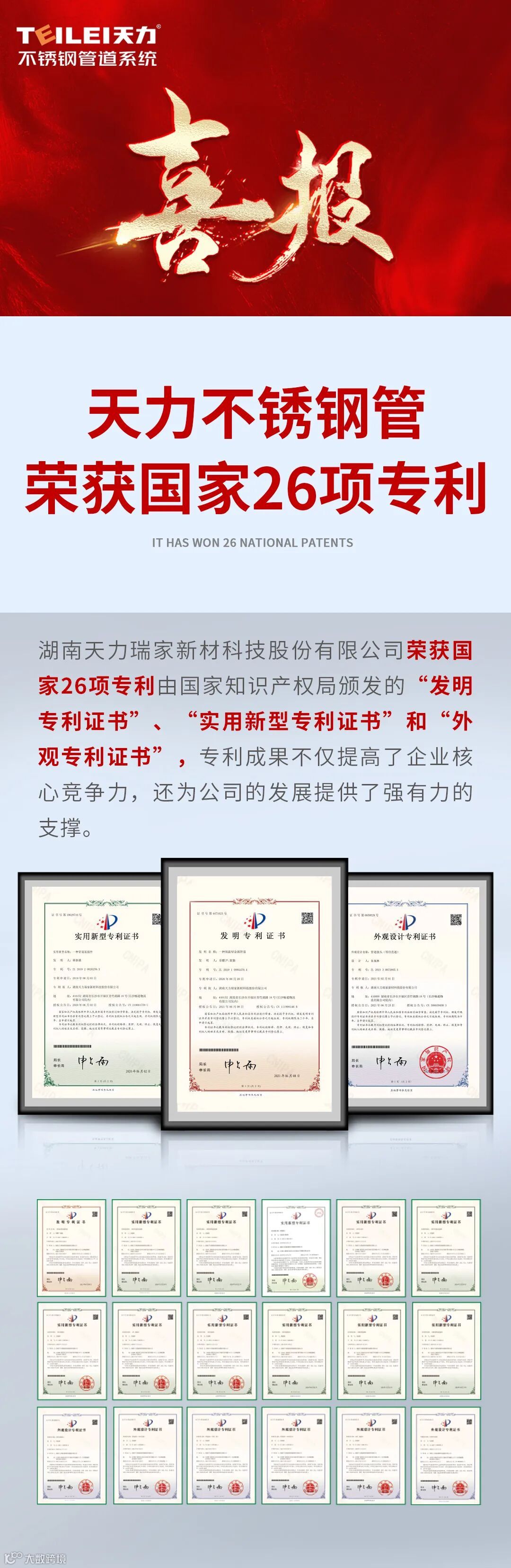 喜报:天力不锈钢管研究成果荣获国家26项专利