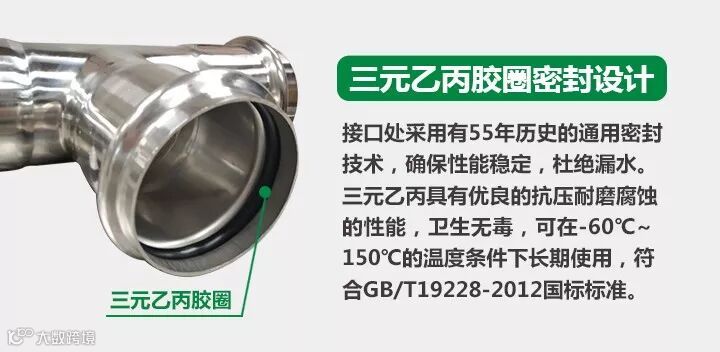 天力卡压不锈钢水管,其密封圈采用拥有55年历史的国际通用密封材质三元乙丙胶材质(EPDM),可有效抵抗热、光、氧气。三元乙丙胶本质上是无极性的,对极性容易和化学物具有抗性,吸水率低,具有优良的抗光、抗热、耐候耐老化性能,进一步提升防爆、防漏、防震性能,杜绝漏水隐患。