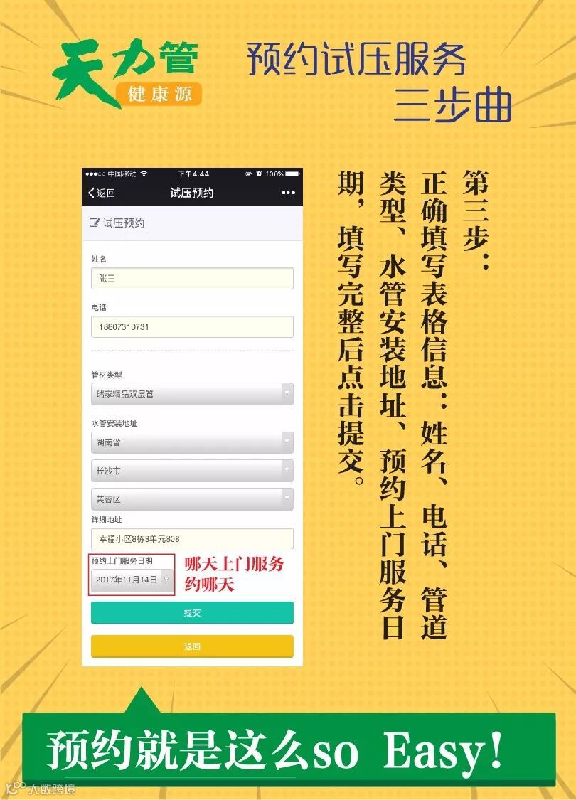 3、正确填写表格信息:姓名、电话、管道类型、水管安装地址、预约上门服务日期(生日、三围、银行卡密码不要随便往上填哦!不然后果很严重。)