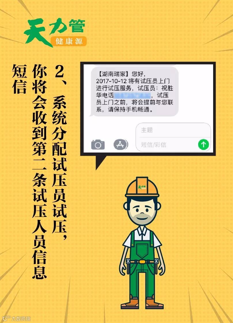 2、系统分配试压员试压,你将会收到第二条试压人员信息短信(你就可以在家喝杯82年的可乐,坐等试压员上门服务了)