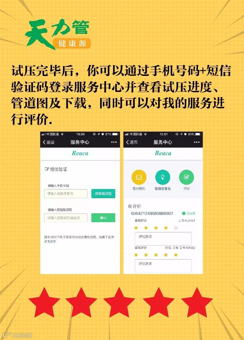 试压完毕后,你可以通过手机号码+短信验证码登录服务中心并查看试压进度、管道图及下载,同时可以对我的服务进行评价(亲,对我们服务满意请给五星好评哦,么么哒)