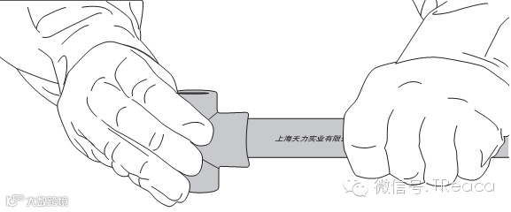 用毛刷涂抹胶粘剂,先涂抹承口后涂抹插口,随即用力垂直插入至划线位置,插入粘接时将插口稍作转动不超过90度,调整间隙以利胶粘剂分布均匀,稳固约30s至1min使粘接牢固;