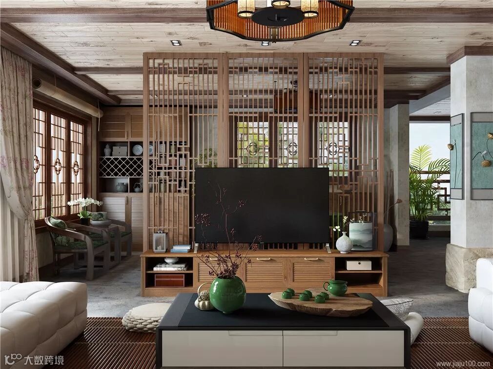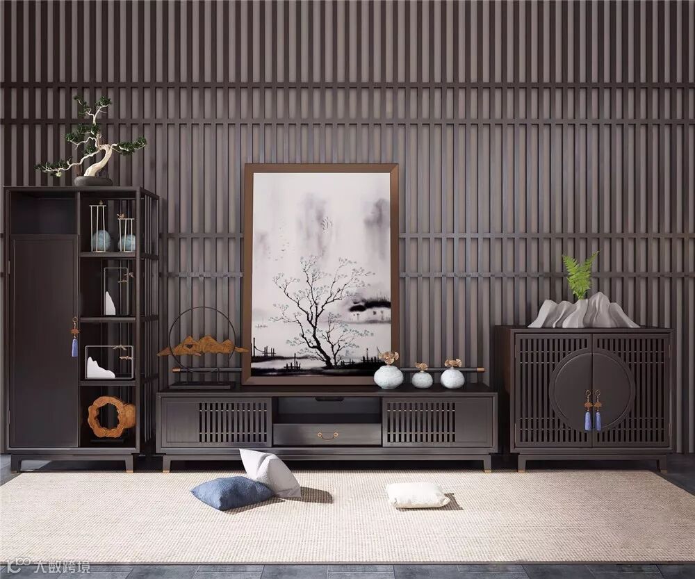 1、客厅当中除了电视、沙发之外,不可缺少的就是电视柜,它能够为客厅起到很好的装饰作用,新中式是现代装修的一种,在风格上面延续了新中式家具的特点,通过我们对中国文化的了解,再将现代的实用性与传统性给结合起来,不仅保留了传统的复古艺术,而且还加入了现代的设计,更得现在人们的审美。新中式风格的电视柜给人一种低调沉稳、又不缺乏现代艺术的时尚感,加上简单的线条结构,与实用性,给人一种典雅的视觉感。