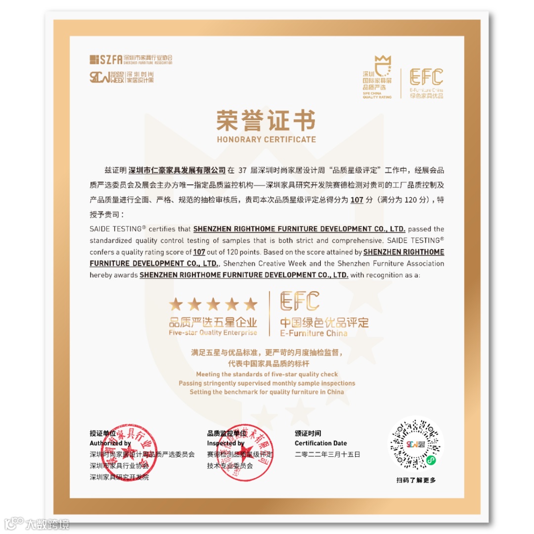 仁豪家居在37届深圳时尚家居设计周的“品质星级评定”工作中,荣获深圳家具行业协会颁发的 “中国绿色家具优品”