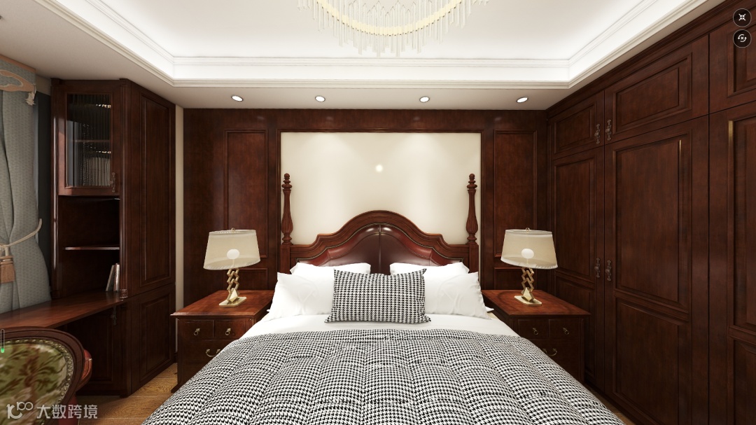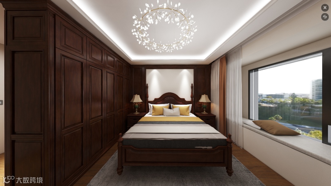 6.客厅和沙发、卧室背景墙配上第五大道,整个房间的高级感又出来了,包括垭口套,实现家具、定制、护墙材质颜色统一化。