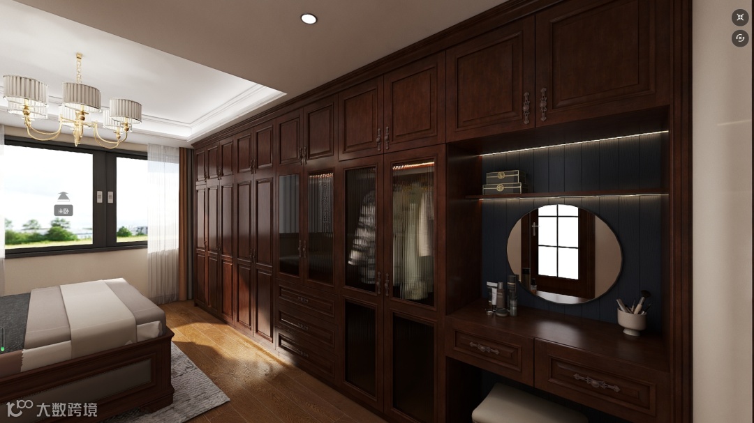 3.主卧要求床对面做一排柜子,由于主卫卫生间也比较小,然后利用主卧一排柜子,划分出梳妆台的空间;
