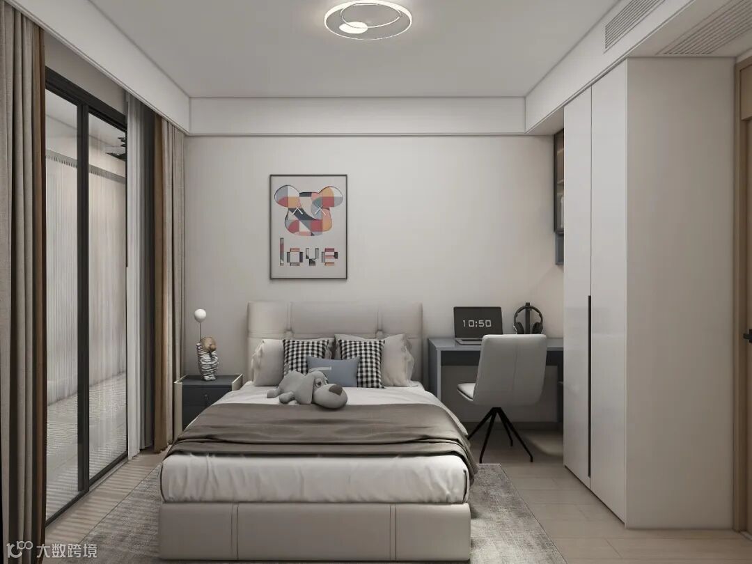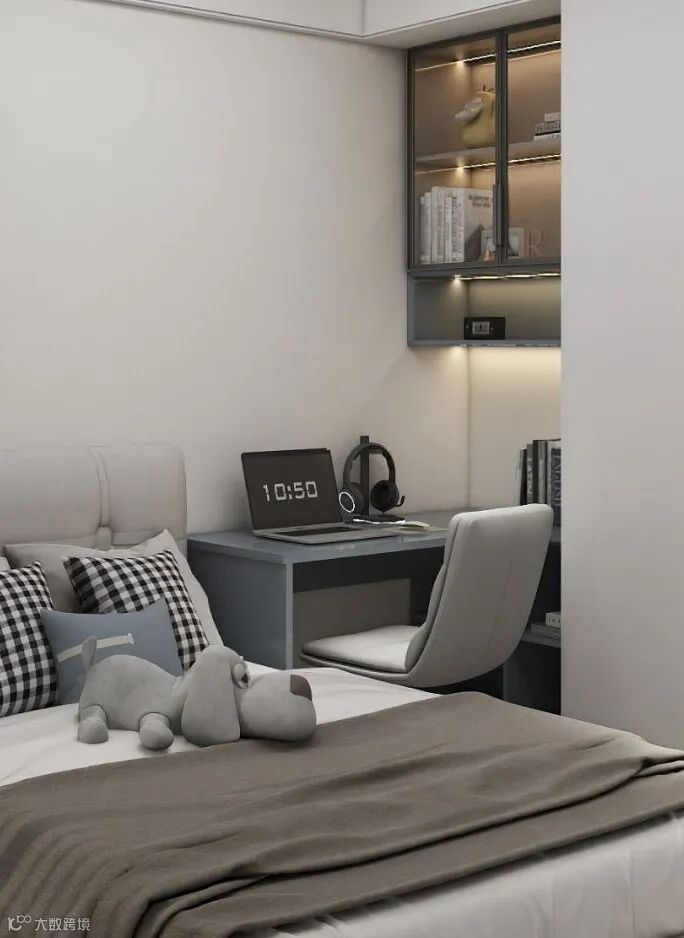 卧室设计巧妙运用了低饱和度的灰色与白色调,交织出一种内敛而宁静的温馨氛围。家具选择上遵循简约风格,融入现代设计理念,使得每一件单品都既精致又优雅,充分体现了不凡的生活品质和艺术审美。