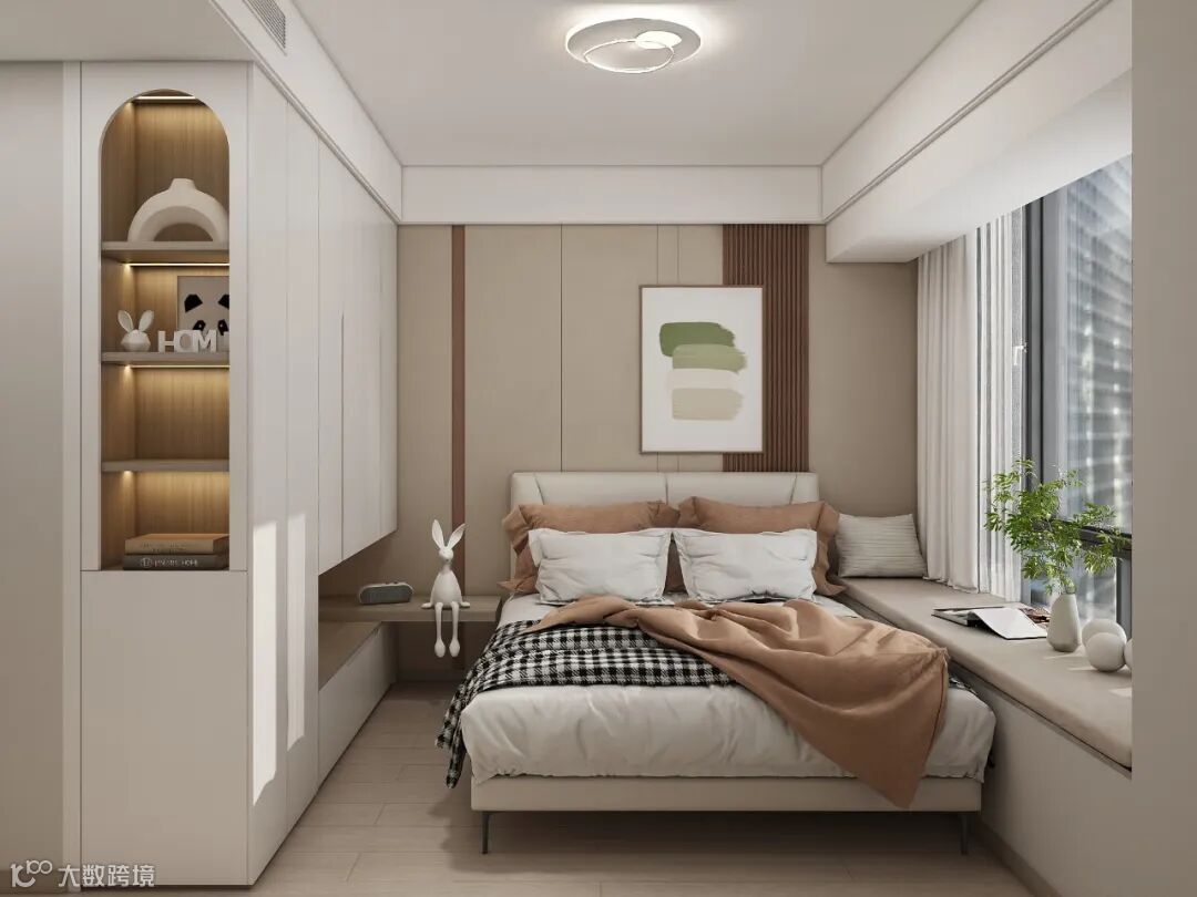 卧室以经典的白色和卡其色作为主色调,点以温馨的橙色,不仅构建出淡雅宁静的视觉效果,同时也展现出一种现代都市生活的内敛与高雅。光线巧妙地洒落在层次分明、布局合理的家居软装上,这种自然随性的光影为卧室增添了温馨舒适的氛围,让人尽享静谧与惬意的私密空间。
