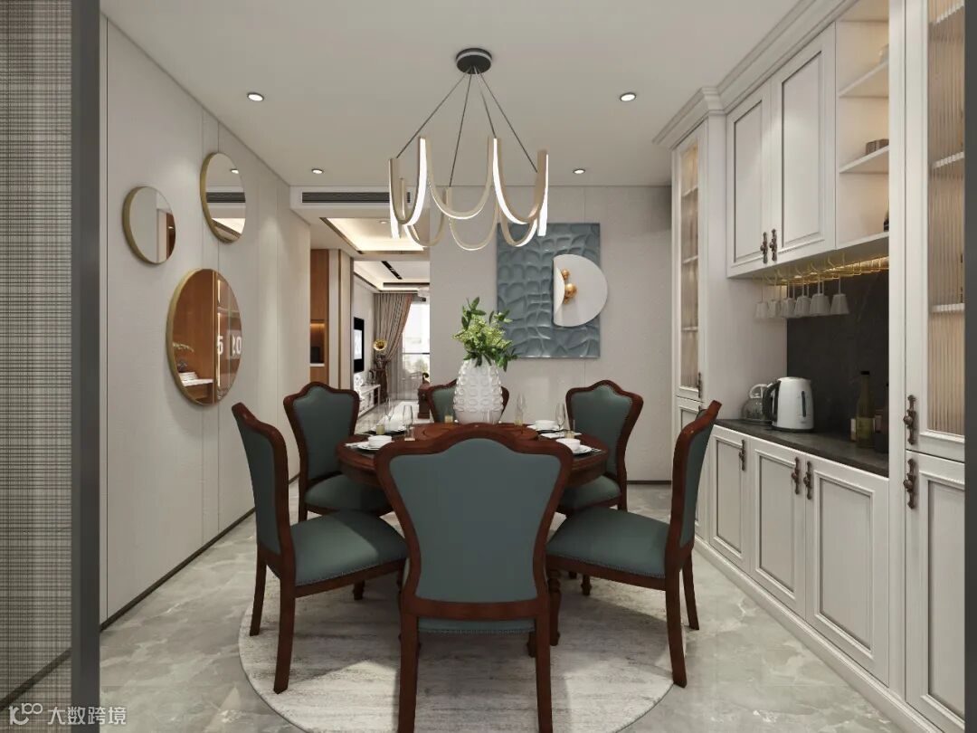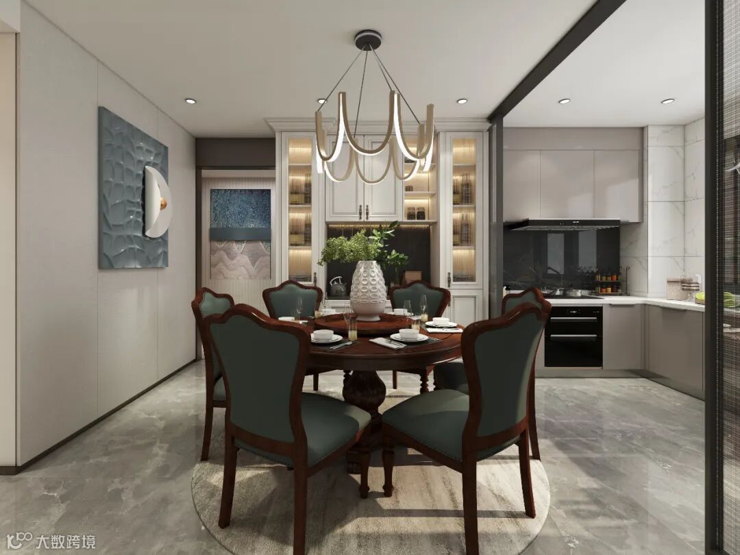 餐厅链接厨房,可组大气阔绰的公共空间,餐厅放得下一张美式大圆桌,同时还留出了餐边定制柜的空间,随时可以为家庭聚会准备可口的甜品茶点,实现中西双厨的格局。