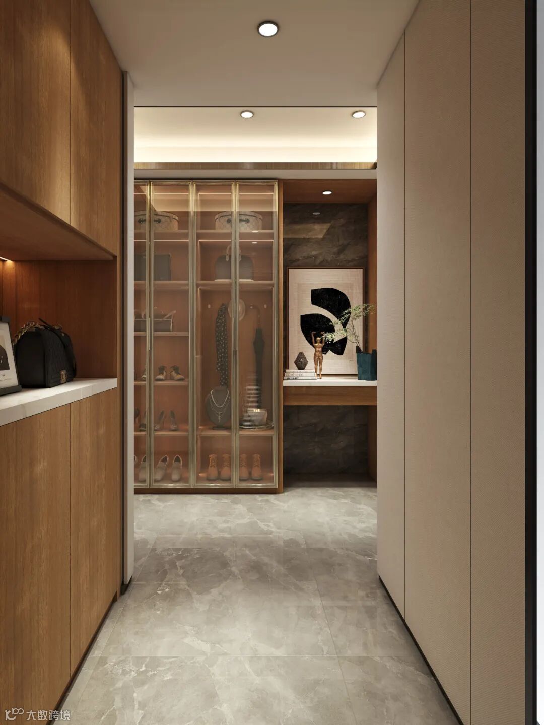 第五大道不仅将入户第一眼视觉效果放大到极致,还能满足家庭成员的各种「居家」需求。由入户衣柜+入户鞋柜+玄关台共同组成的公共空间,这样的大尺度入户柜体设计可以说非常阔绰。