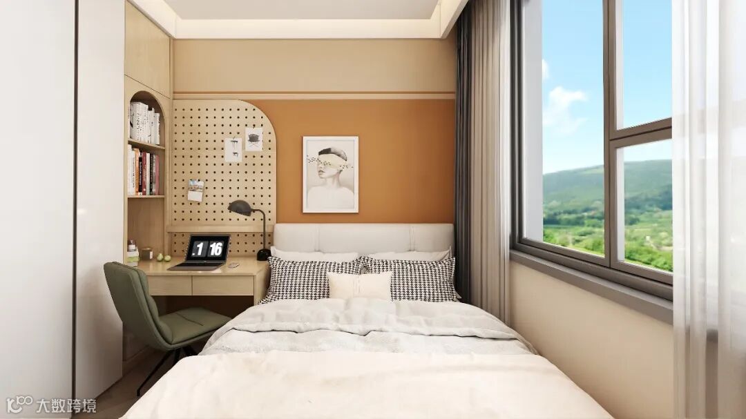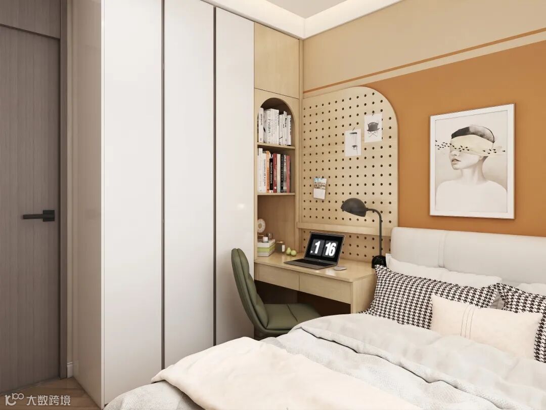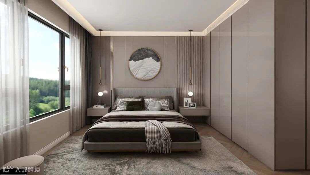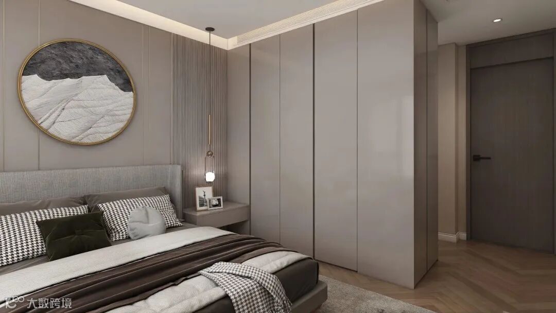 卧室雅灰与暖棕,给空间带来恰到好处的沉静感,注重美的形式感。凹型床头屏 的亮点设计,犹如传递出一种在这张床上两人相拥包围的信号;整款床简约时尚,外奢意尽显!透亮轻奢的全包衣柜、富有质感的灯具、舒适柔软的床品、禅意山水画,使空间更富生活情感,彰显主人的品味与格调。