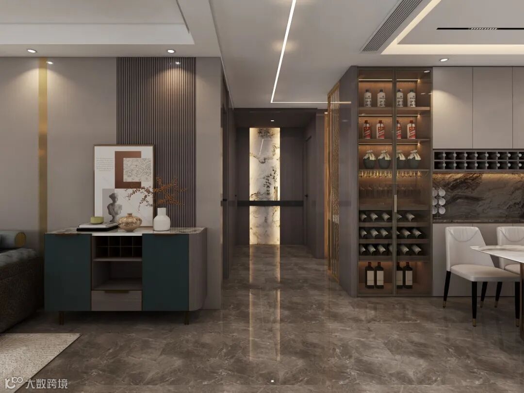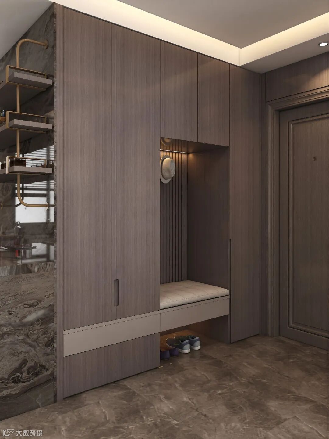 现代简奢主义的家居风格通常不使用过于活泼的色彩,善用精炼的线条划分不同的功能区,以便满足玄关空间的收纳需求,本案的入户柜就是如此。