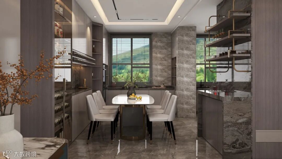 餐边柜除了满足收纳,也起到重要的装饰作用。由上至下的玻璃材质柜门,为空间增加通透性,中间留空设计,便于放置小物件,维持台面整洁,营造一个舒适的用餐环境。