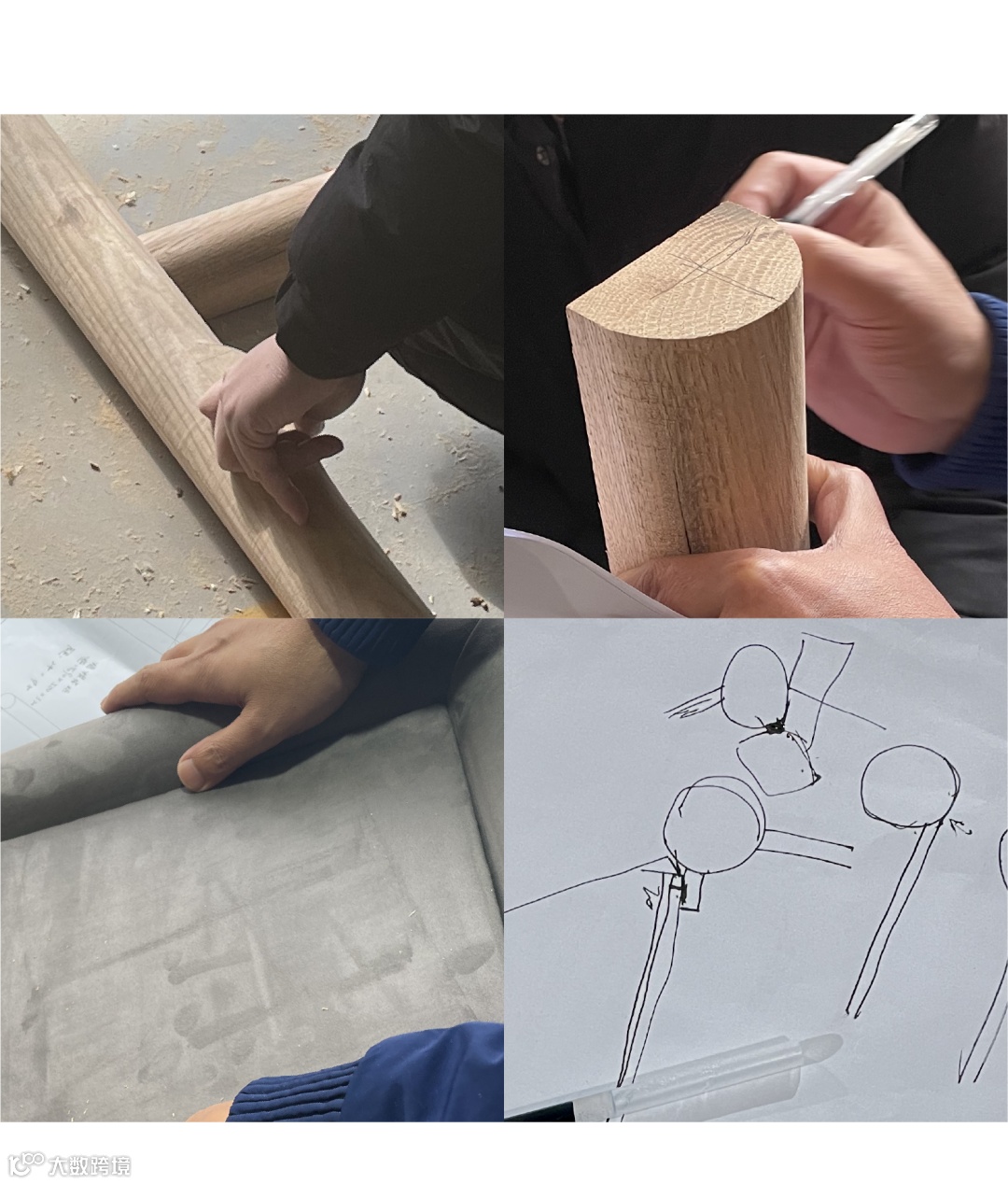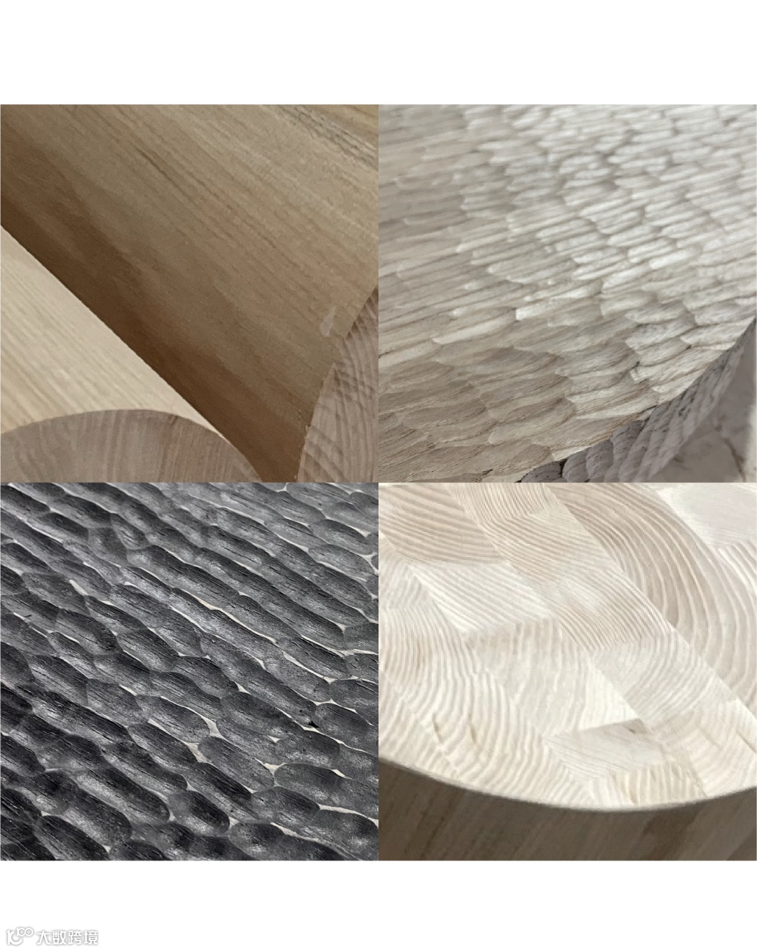未满由四个家具造型分别运用半圆柱体的四种构成方式,通过不同的逻辑关系组合,尝试传统凿痕做表面机理,尽可能的表达木材的原始美感,手工凿痕的介入也让制作标准成为一种松弛的状态,起到调和及“容错”的作用。