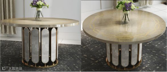 佩斯利这款圆餐桌灵感来源于古希腊的罗马柱,底座由12个单元模块组成圆柱支撑桌面,洁白的珍珠母贝。高雅大方,桌面盥案描金,两条线交错相连,犹如希腊雅典向往和平的橄榄枝花环。