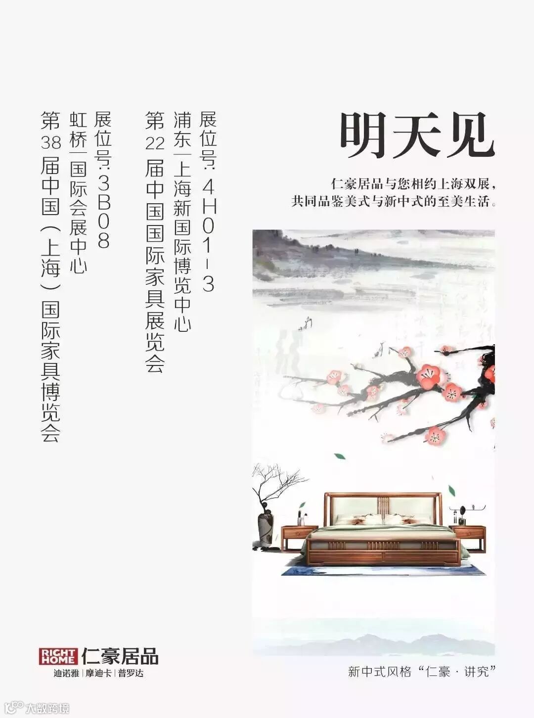 继今年3月参加深圳国家家具展精彩呈现六大原创系列产品、7月广州建博会全面出击全屋定制,以十七载“原创设计、精湛工艺”闻名业内的中国最大的家具企业之一,仁豪居品又临上海,此次不仅携双“美”同行,参展第38届中国(上海)国际家具博览会;此外,更携手战略合作伙伴红星美凯龙,在第22届中国国际家具展览会上创意发布旗下新中式品牌仁豪·讲究。有关业内人士惊呼,“仁豪上海双展玩的真大”。