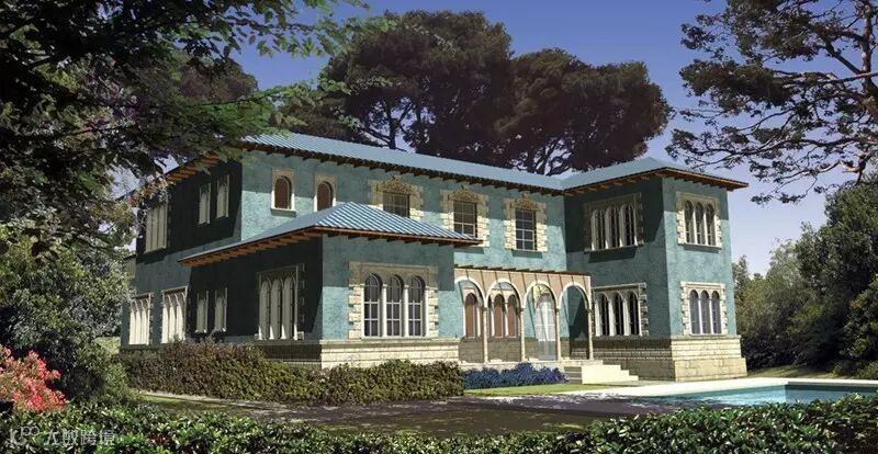 对称设计的法式别墅以主轴线控制整体,与纵横相交的次轴线组成严谨的集合格网,主次分明。这样做,既突出了空间布局的几何性,又可以产生丰富的空间层次感和节奏感。在室内装饰上,法式别墅多采用天然石材、高档实木家具、复古饰品、喷泉、雕像、园林小品作为装饰元素,以充分显示其雍容华贵的气质。当然,在法国南部地中海海岸,此类建筑则更多讲究海边风情,因此室内设计也往往采用地中海风格。