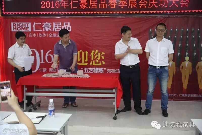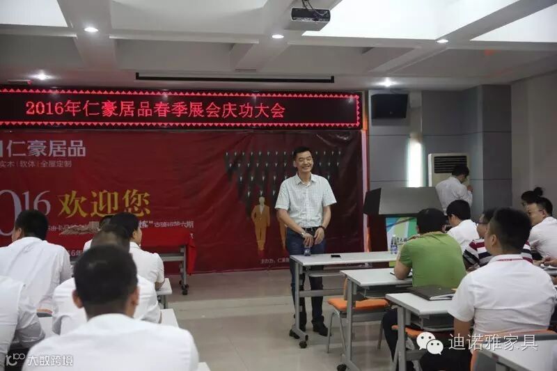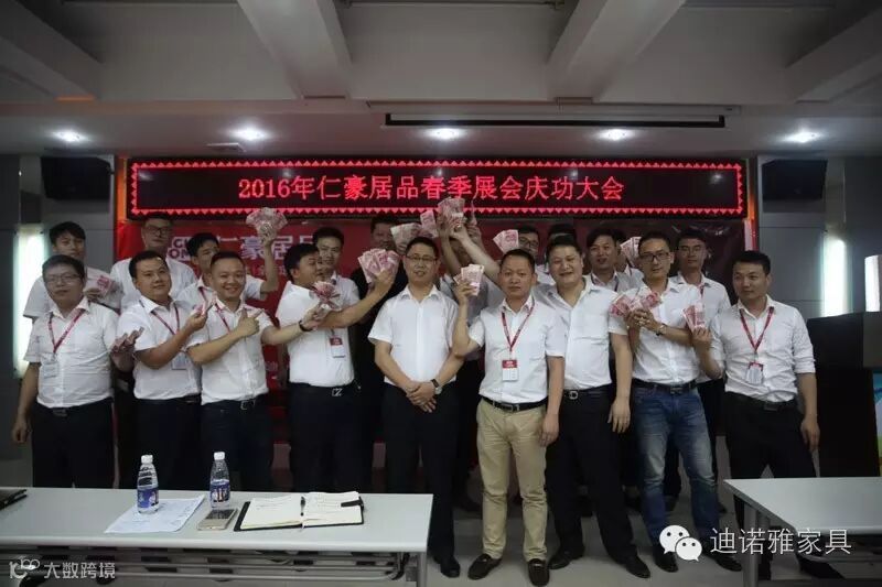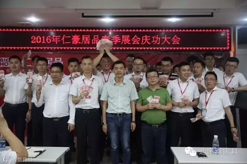 2016年5月12日,仁豪居品2016年春季展会庆功大会在深圳总部盛大召开。仁豪居品总经理王晓峰、摩迪卡黄总、迪诺雅卢总出席活动,为各位销售精英颁发了现金奖,并对各位销售精英提高出业绩稳步增长,服务质量跨越式提升的更高要求。