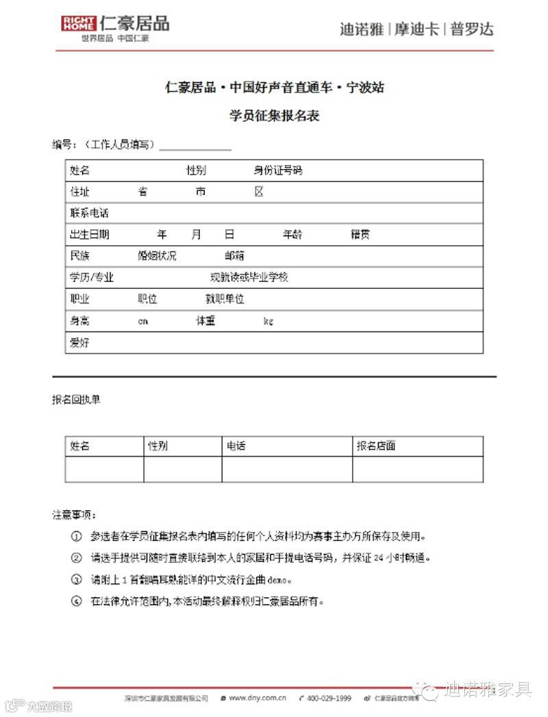 经过一系列紧锣密鼓的准备,仁豪居品中国好声音直通车·宁波站终于启动报名仪式啦!!自3号开始,第一位好声音梦想者报名以后,报名者雨后春笋般通过网络,店面,商场等渠道陆续报名。不管是青春正盛的妙龄女郎,还是三十而立的公交车司机,只要你音乐有梦,好声音的舞台总会为你大开方便之门。