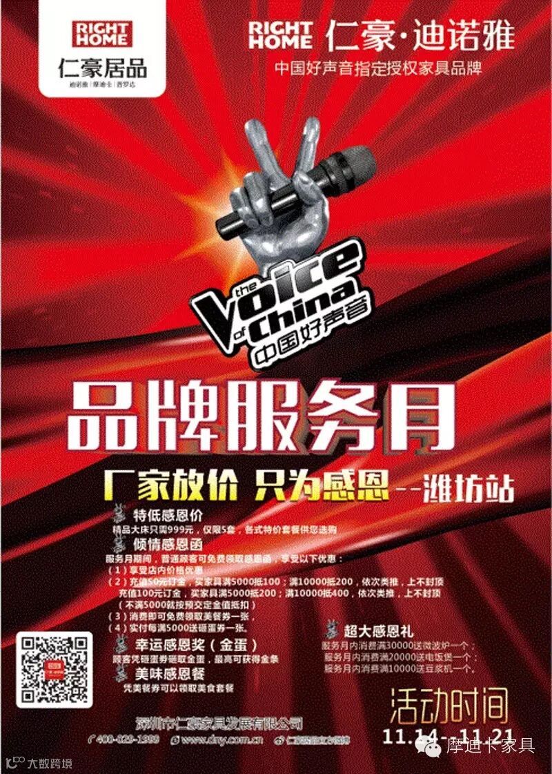 去年以来,仁豪居品携手中国好声音,开启娱乐化营销,缔造全新品牌形象!仁豪·迪诺雅作为仁豪居品旗下强力品牌,品质早已享誉市场,深入消费者。本着消费者至上的理念,活动现场超低价推出新产品,欢迎抢购!