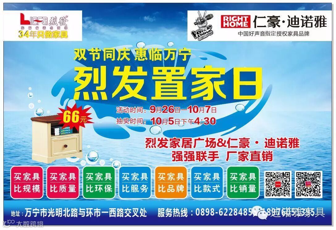 “烈发置家日”是仁豪集团携手万宁家居航母烈发家具城的一场大型促销让利活动,旨在以最多种多样的活动套餐以及最优惠的价格提升万宁区域的家居品质,提升仁豪·迪诺雅品牌影响力;活动期间更有66元购床头柜,进店抽红包,砸金蛋,抽大奖,送豪礼!更多惊喜等着您。