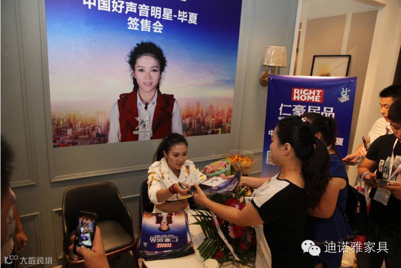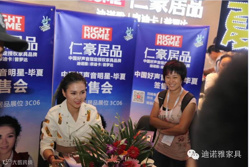 除此之外,好声音人气歌手毕夏莅临仁豪居品展厅举行现场签售会,限量版CD独家签名发送,更是引来不少参观者在仁豪居品展位前聚集,甚至排起了长龙,手拿CD进店参观。好声音人气歌手毕夏的粉丝号召力充分说明了仁豪居品成功的开启了家具娱乐化营销时代,打造出了品牌营销策划的一条崭新之路!