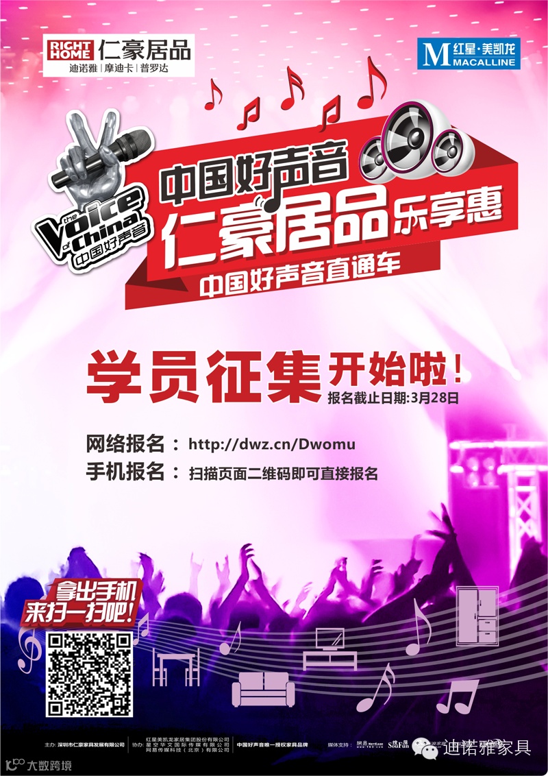 音乐不断,成就梦想,仁豪居品期待你的参与!“中国好声音—仁豪居品乐享惠”全国火热报名中...