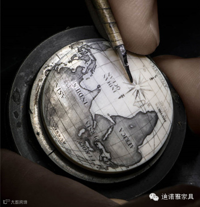 在雕刻完表盘后,工艺大师便开始用墨水对图案进行着色,凸显细腻的细节并突出对比,赋予图案栩栩生机。黑色墨水渗透到作品底部,如同为作品注入无限动力。而微妙的光影效果令未着墨的刻点带来柔美的亚光——令人乍以为这是一张羊皮地图。