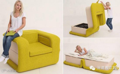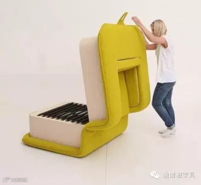 外层使用了质地柔软的羊毛材料制成,平常它是一张舒适又不占空间的单人沙发;只要轻轻地将它翻开就是一张适合午睡的单人睡床。床面黑色部分是松紧带,枕头和床垫都可以藏在里面。这外形有点像以前用来装CD的盒子,估计设计师的灵感可能是来自这个东西。