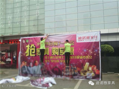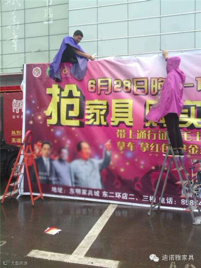 前两天为了让此次活动的氛围更加浓厚,东明家具城东二环店的店员们冒雨在商场外面搭桁架,本来一个小时可以完成的工作,却因为天公不作美下起了雨,结果店员奋战了两个小时才完成搭建。完成任务之后,店员们那挂满汗水的脸露出了灿烂的笑容。