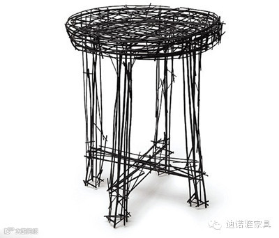 这位主修金属工艺设计的设计师名叫Jinil,来自韩国首尔。他设计的这组名为“画出来的家具”由交叉的钢丝制成,包括两把椅子、两盏台灯和一张桌子。通过将粗细不同的钢丝穿插、焊接在一起,Jinil创造出了“以假乱真”的平面草图效果。“这组作品的关键在于这些‘线条’的弯曲方向,”Jinil说,“它们传达着设计师的感受、地位和情感,而且这些家具足以承受正常人的重量。”