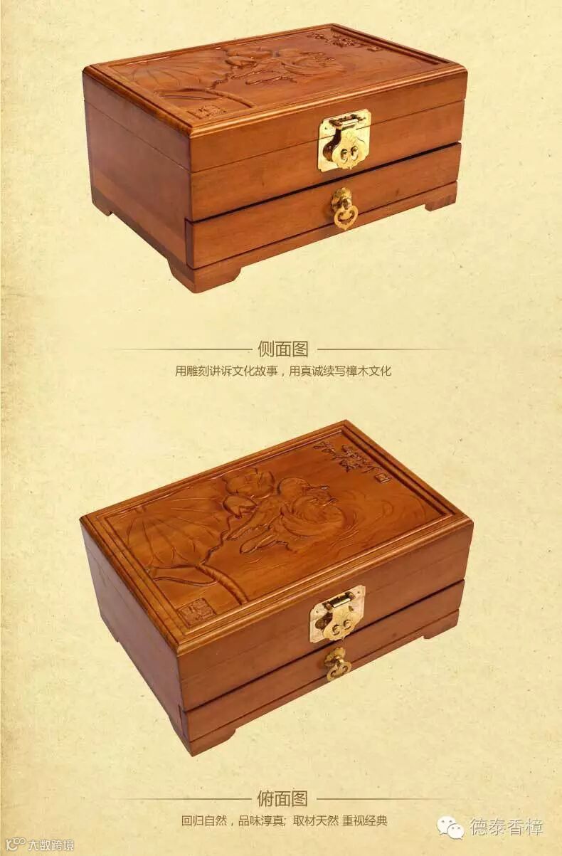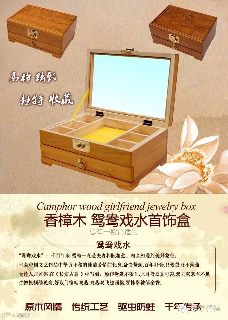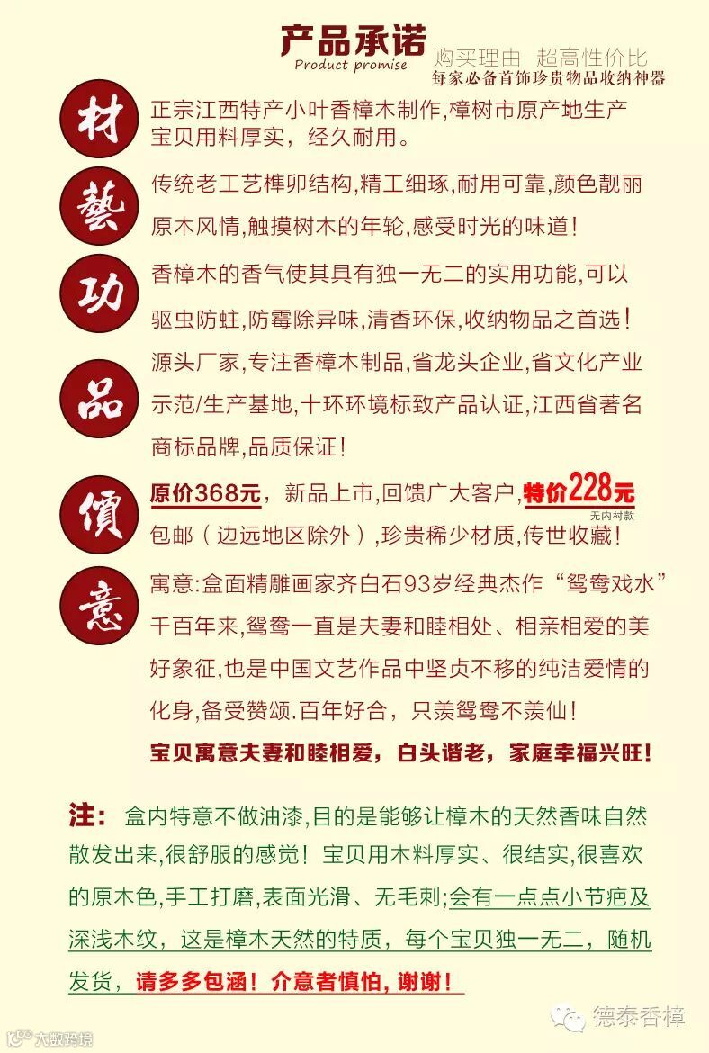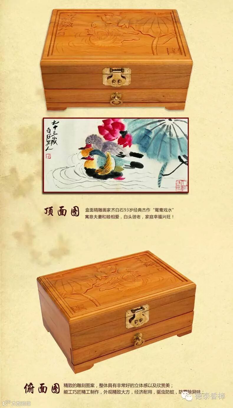 1.盒面精雕齐白石93岁经典力作“鸳鸯戏水”名画,用名贵天然小叶樟制作,燕尾榫结构,传承老式工艺,手工打磨、漆面光洁、经久耐用;驱虫防蛀防霉,除异味,清香持久。在如今高科技的时代里,生活在城市中的我们可能不多见了,是我们生活中必备的日常用品。绿色环保、健康家居新生活!