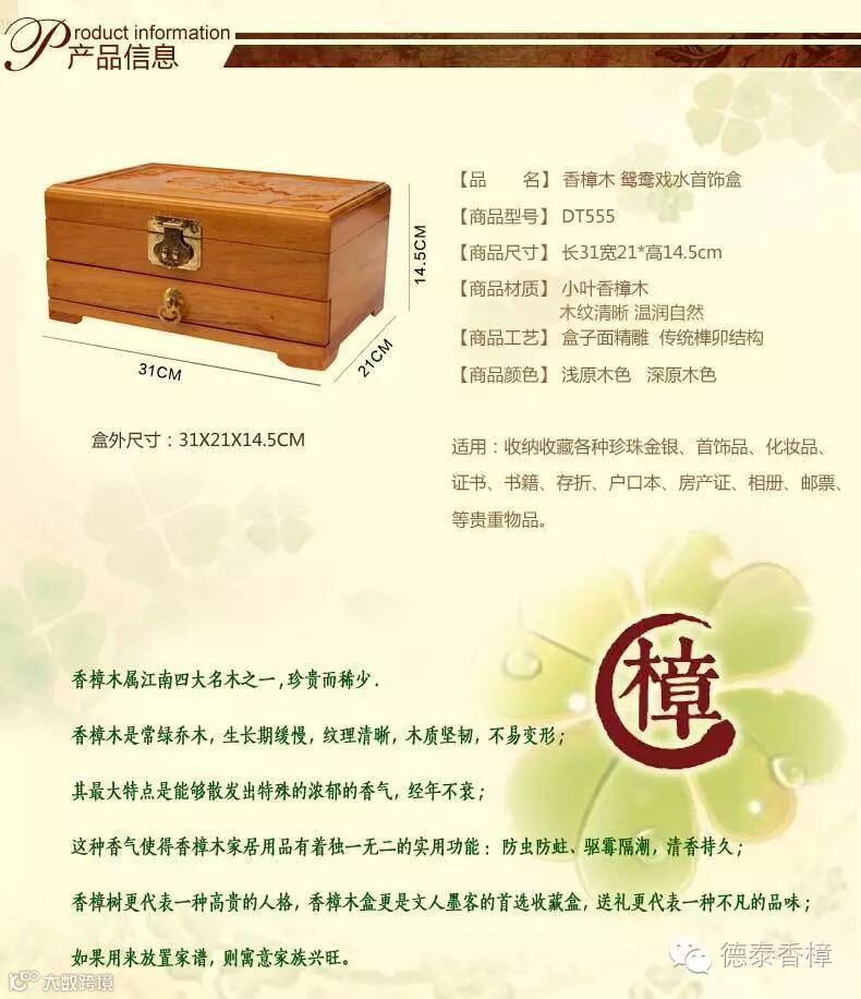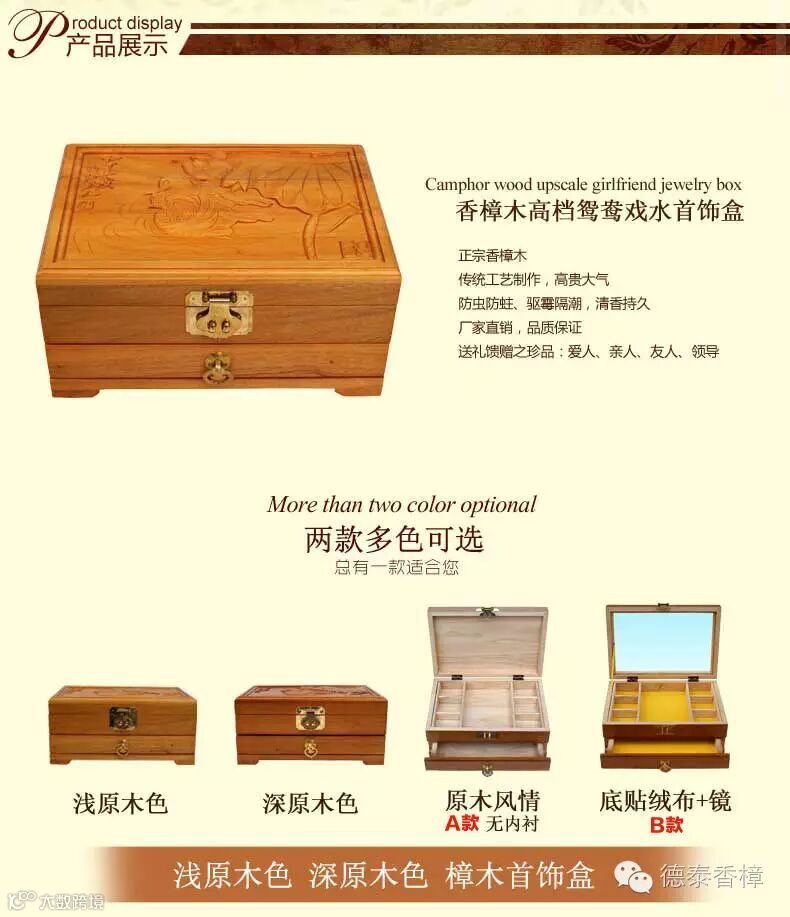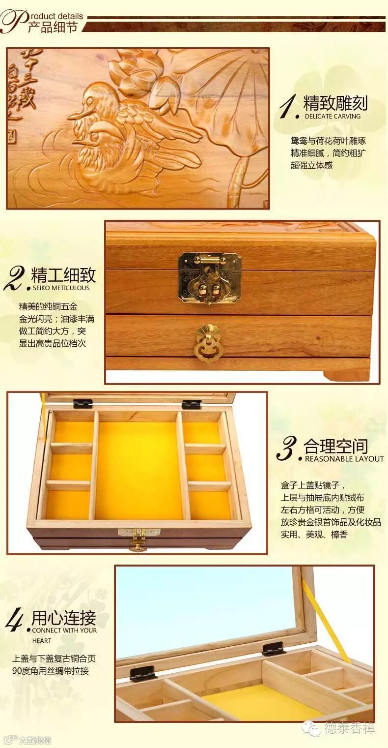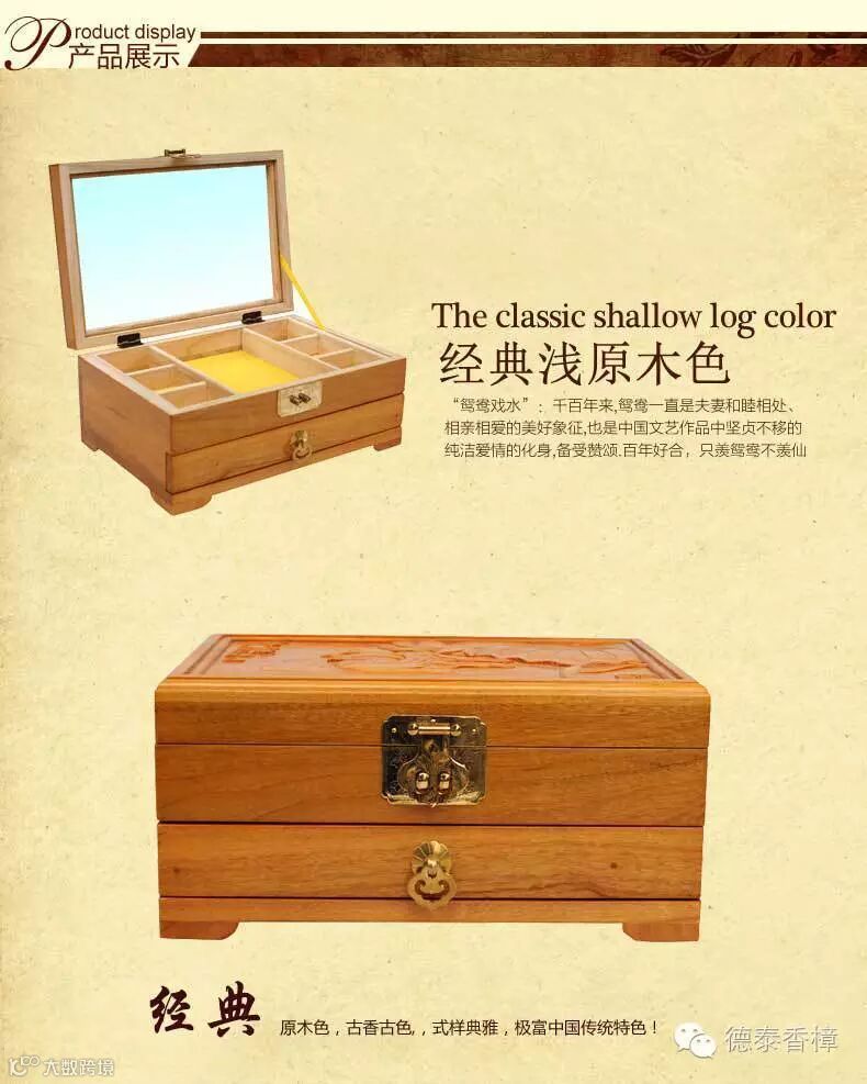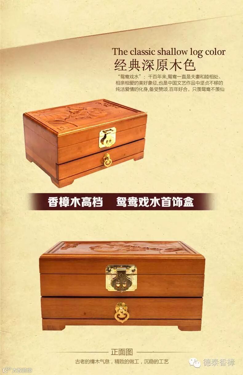 1.盒面精雕齐白石93岁经典力作“鸳鸯戏水”名画,用名贵天然小叶樟制作,燕尾榫结构,传承老式工艺,手工打磨、漆面光洁、经久耐用;驱虫防蛀防霉,除异味,清香持久。在如今高科技的时代里,生活在城市中的我们可能不多见了,是我们生活中必备的日常用品。绿色环保、健康家居新生活!