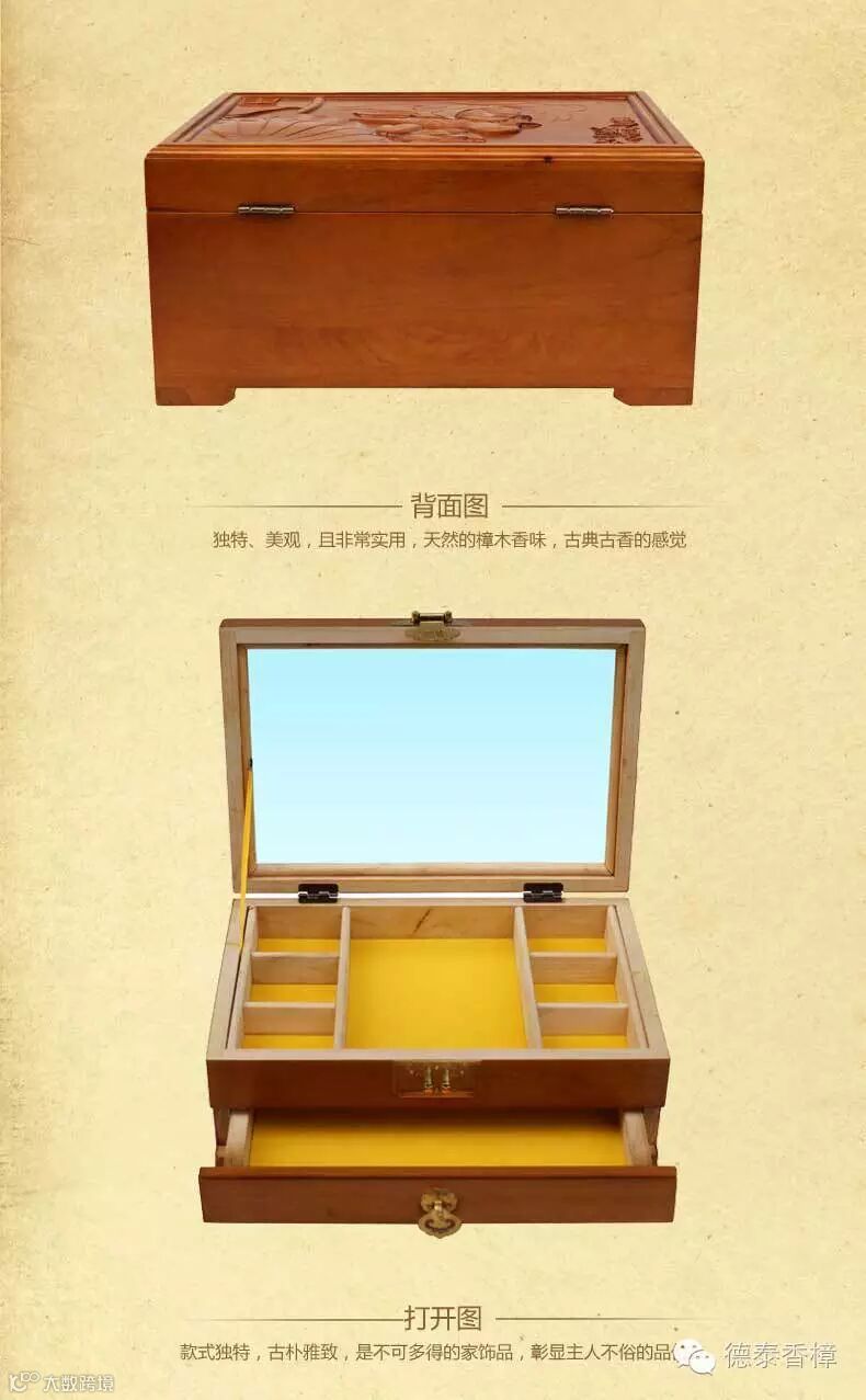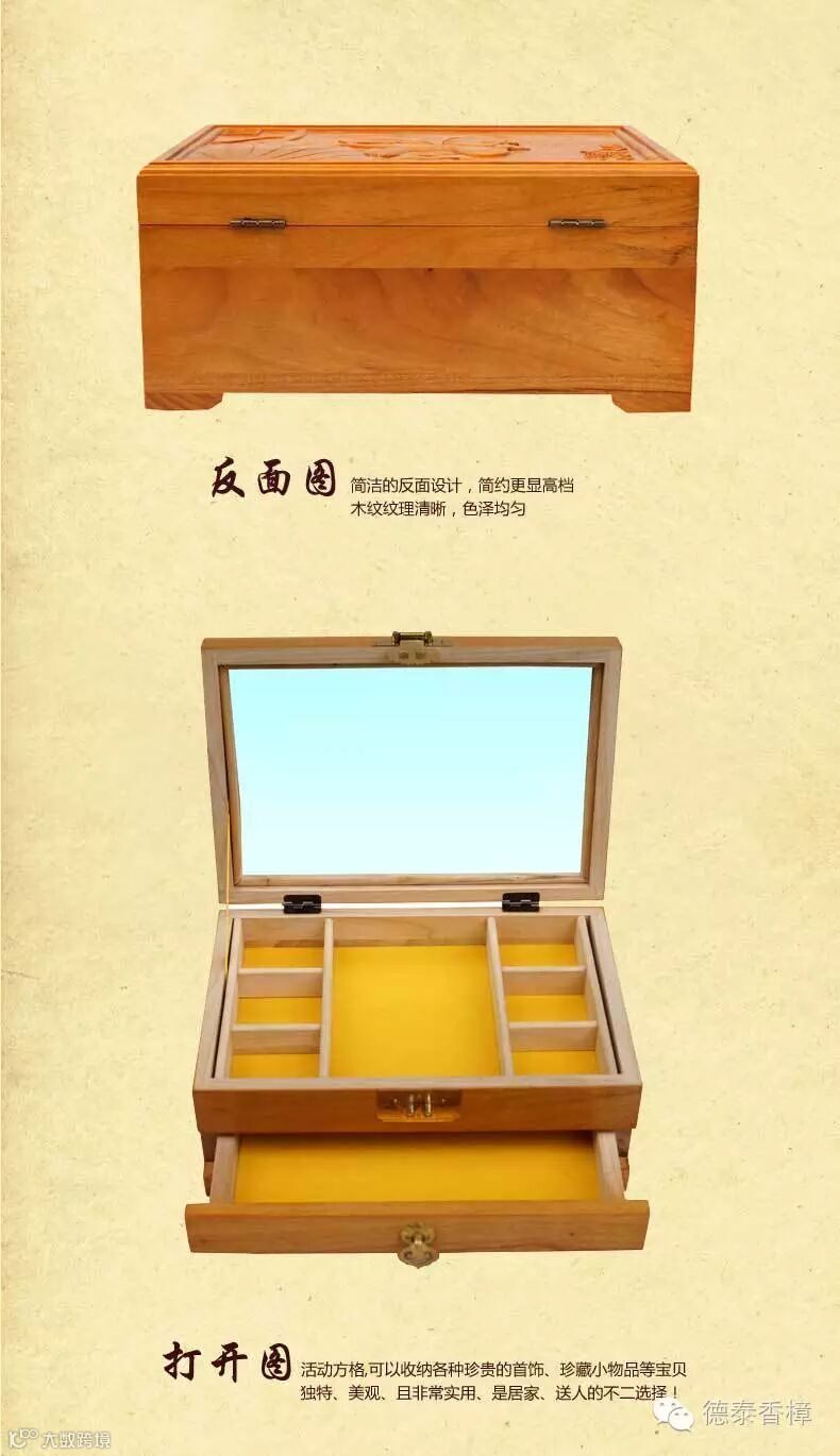2.盒子内贴镜子,底贴绒布,内分小格子带抽屉: