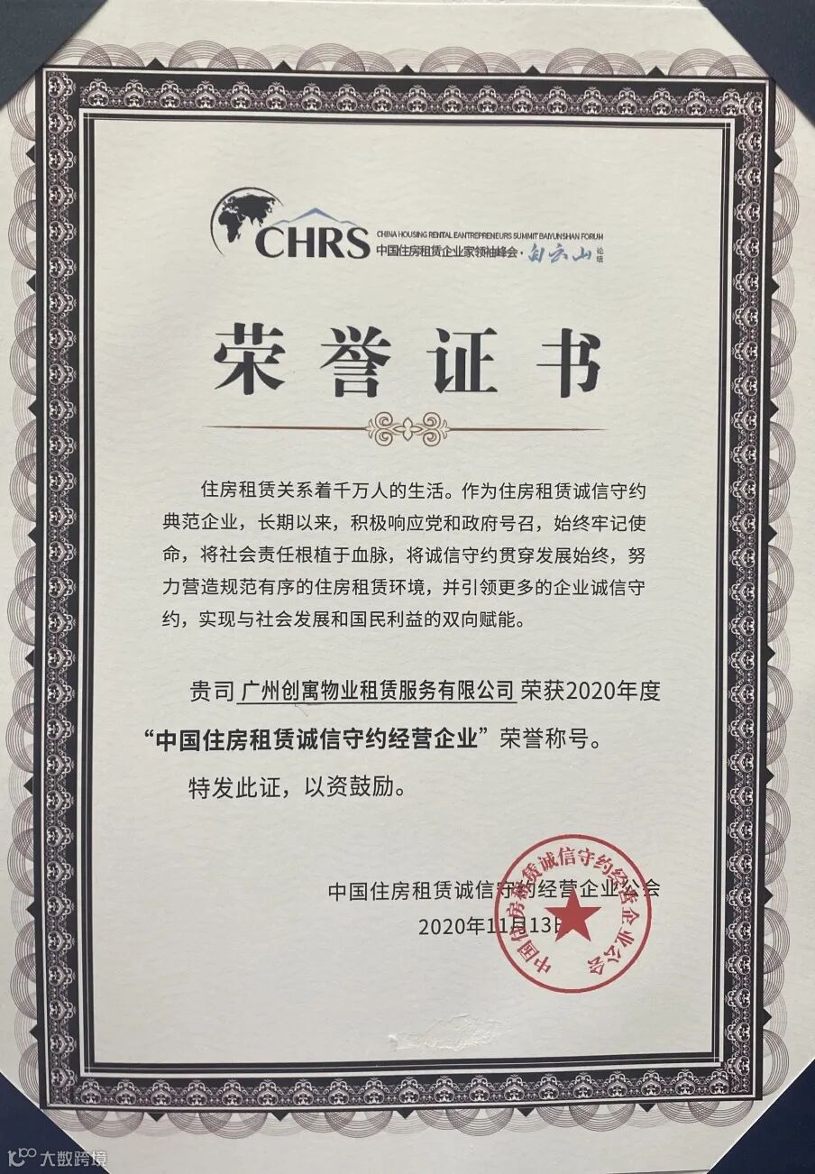 “中国住房租赁诚信守约经营企业”荣誉称号