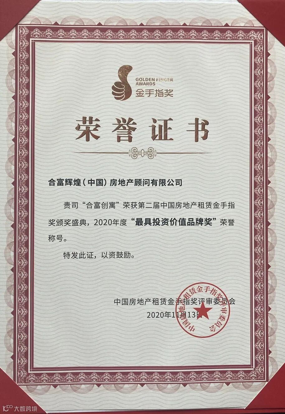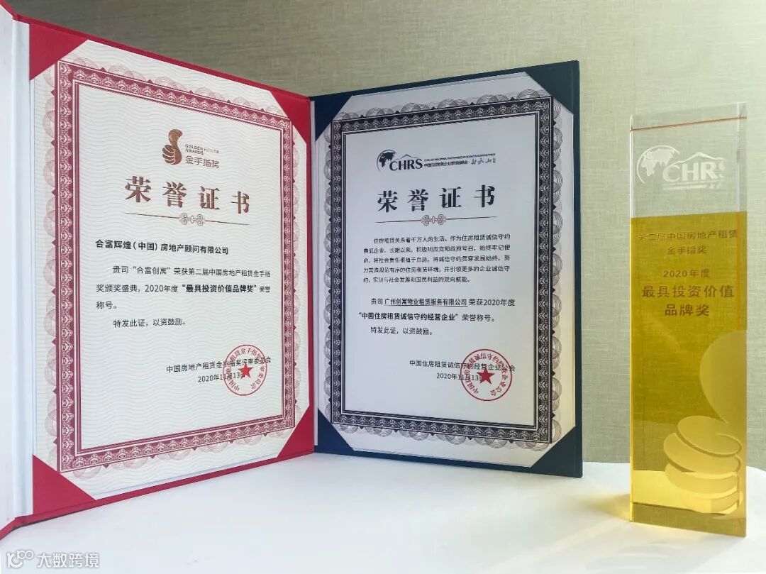 会上合富创寓广州龙洞店荣获了由中国房地产租赁金手指奖评审委员会颁发的2020年度“最具投资价值品牌奖”及由中国住房租赁诚信守约经营企业公会颁发的2020年度“中国住房租赁诚信守约经营企业”荣誉称号。