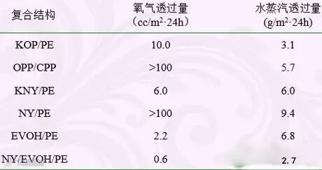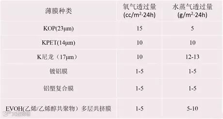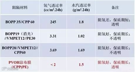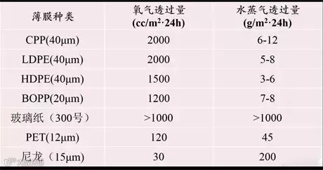市场常规阻隔食品包装材料的阻隔性能如下表: